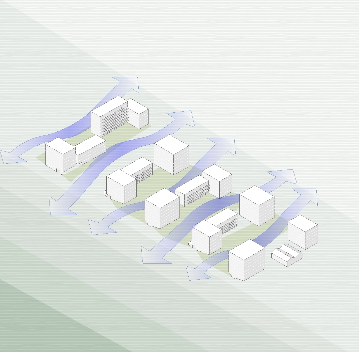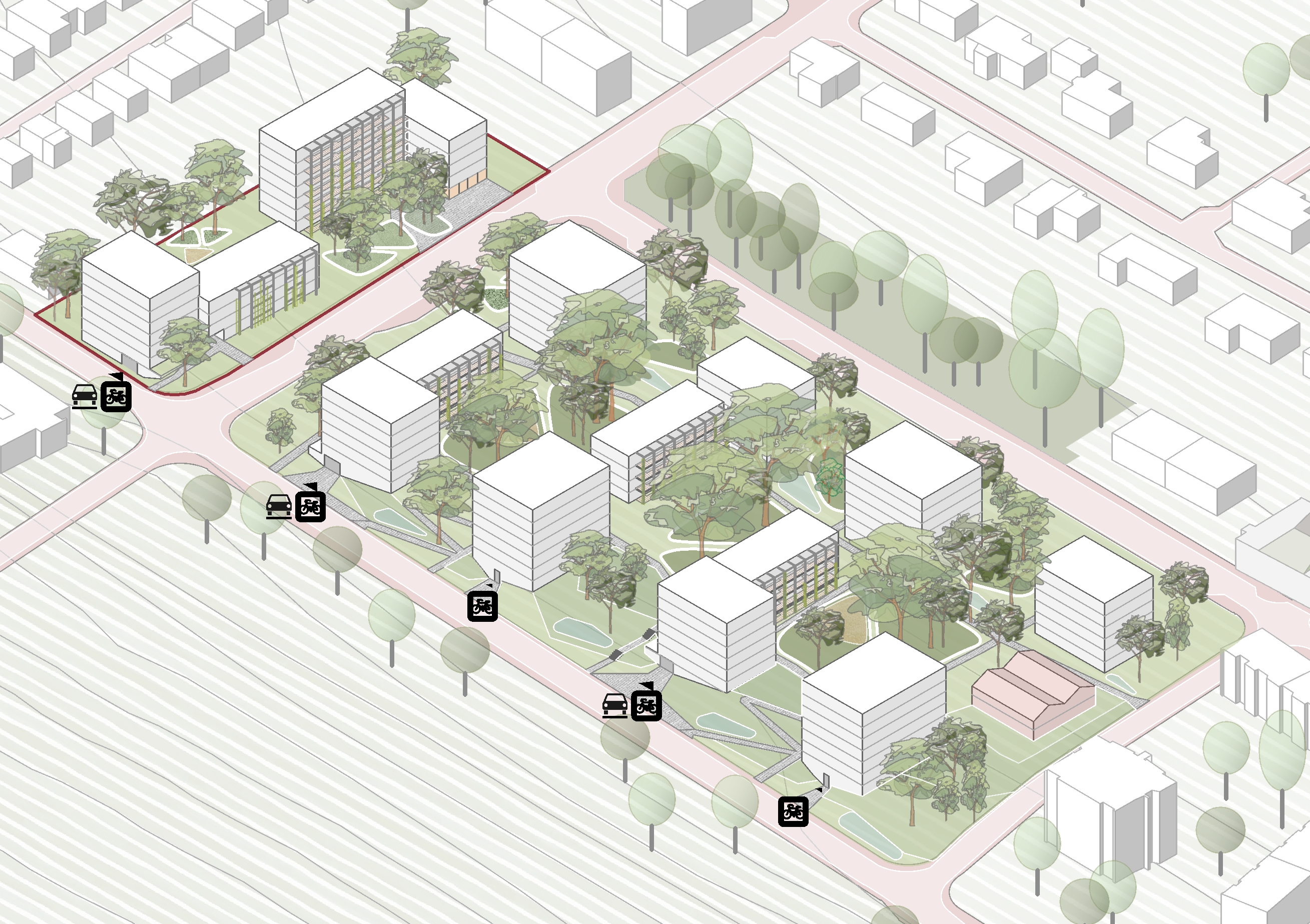 Das Quartier orientiert sich an der bestehenden Zeilenbebauung und fügt sich behutsam in die Umgebung ein. Neubauten werden überwiegend auf den Flächen der Bestandsgebäude gesetzt, um Eingriffe in den Boden zu minimieren und wertvollen Baumbestand zu erhalten. Die Zeilenstruktur wird aufgelockert, sodass durchlässige Räume und identitätsstiftende Wohnhöfe entstehen. Kita und Gewerbeeinheiten liegen an den Rändern und stärken die Durchwegung und Vernetzung.