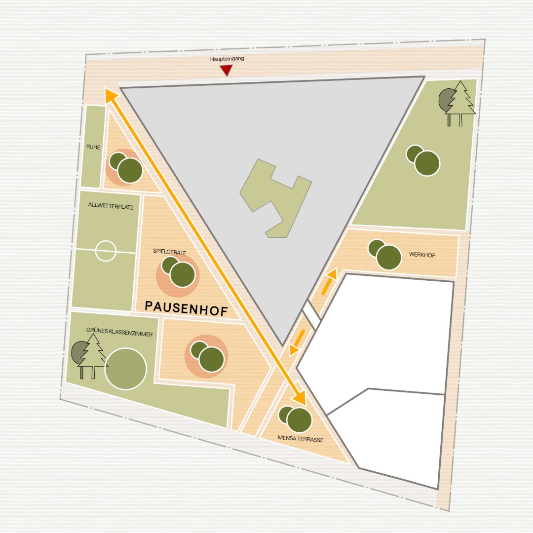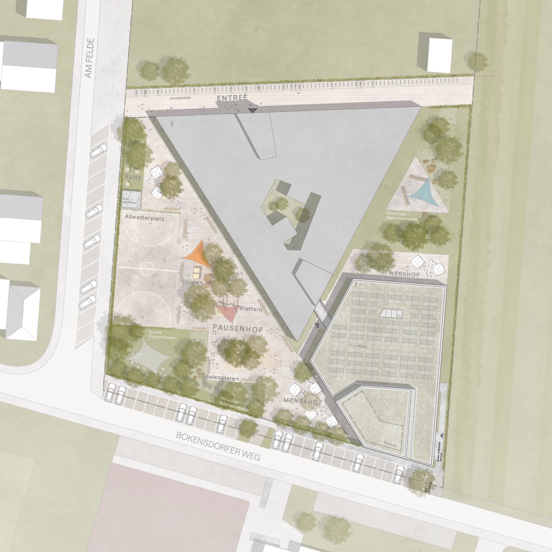 Der Neubau schafft neue Räume für gemeinsames Lernen, Essen, Begegnen – eingebettet in ein Freiraumkonzept mit Pausenhöfen, grünem Klassenzimmer und offenen Rückzugsorten.